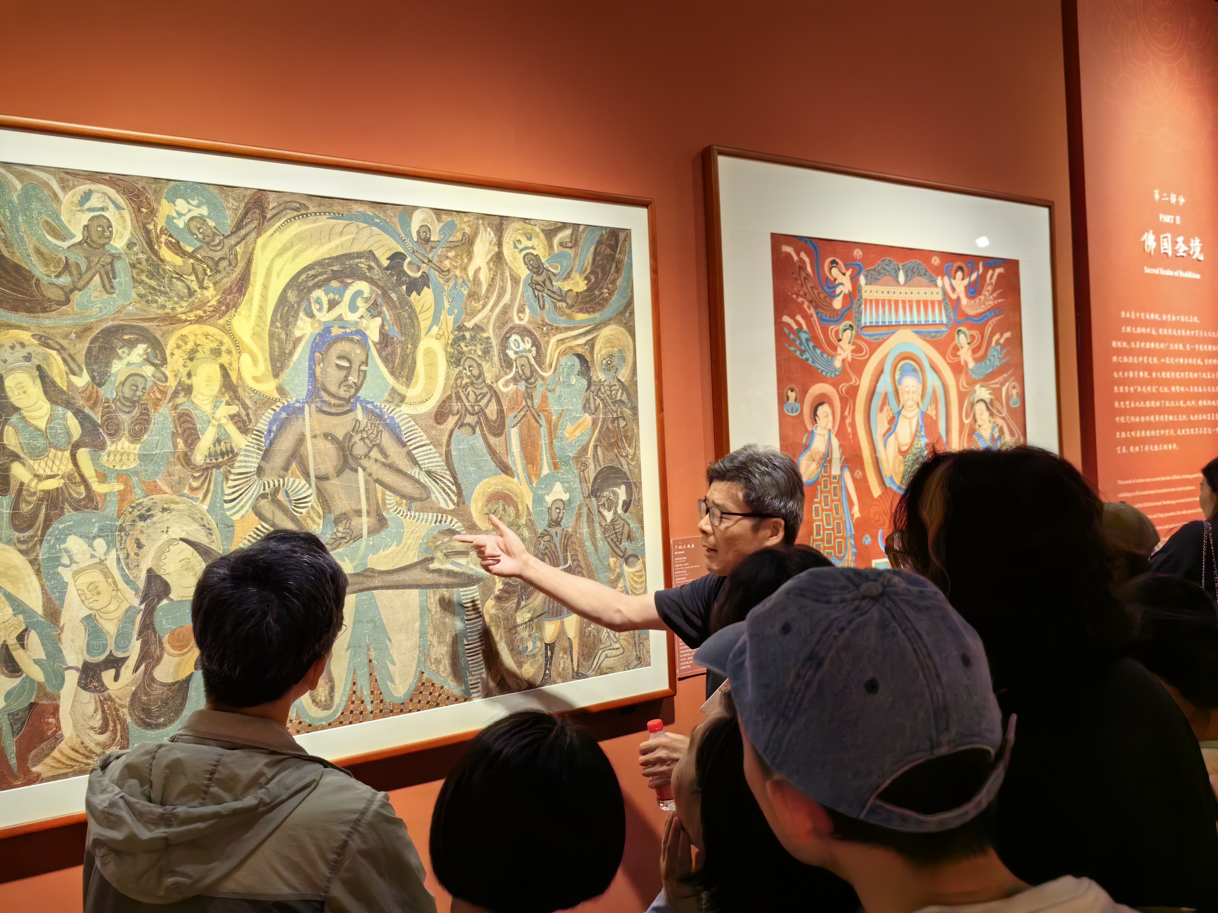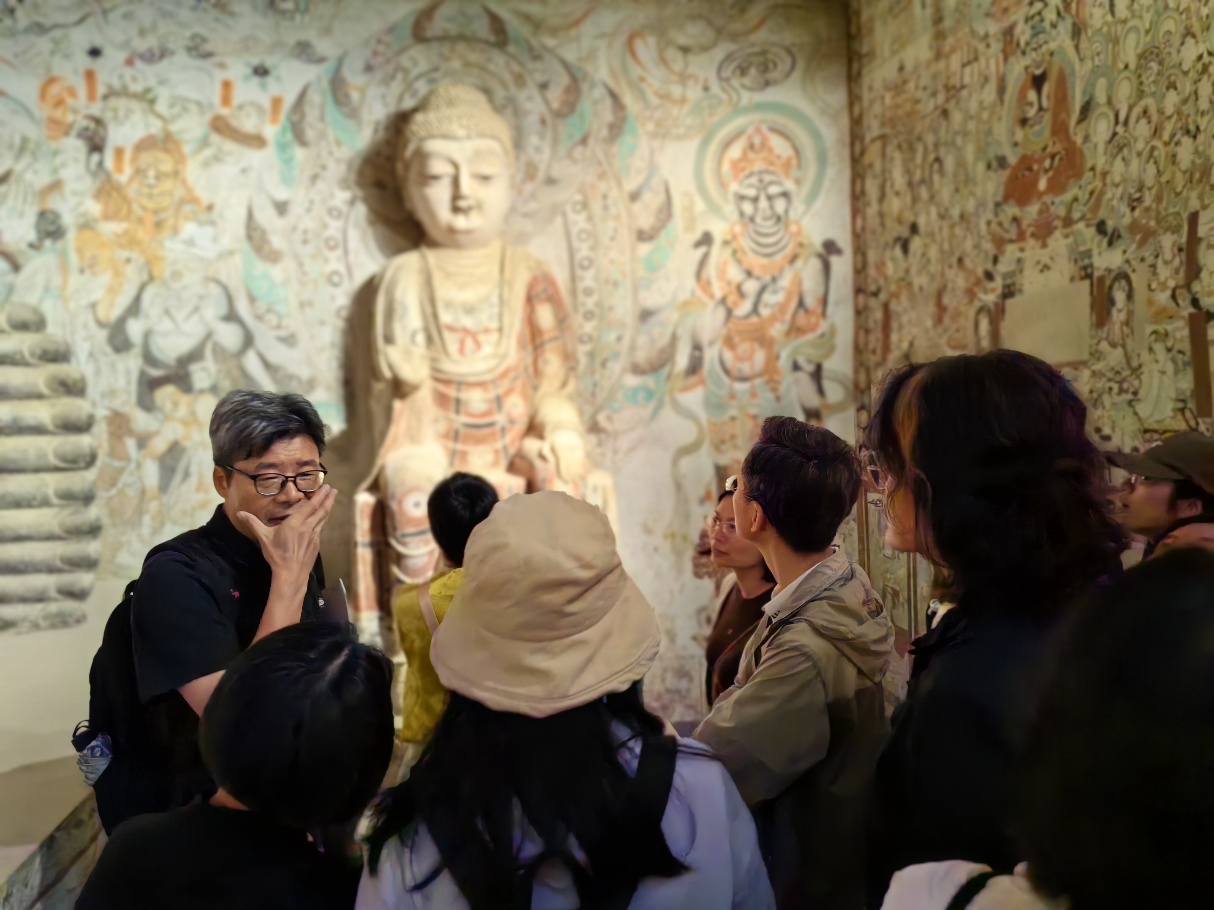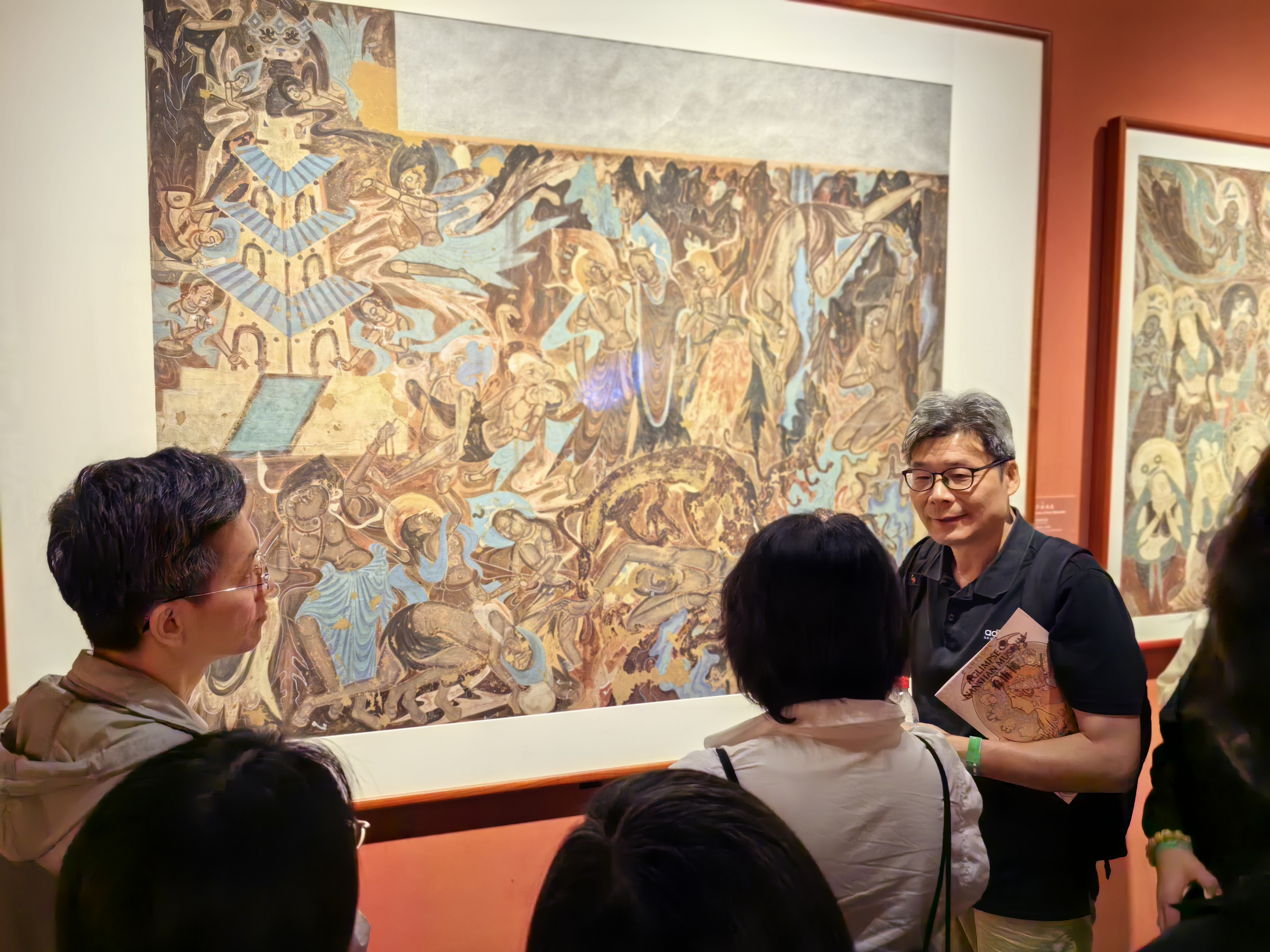 此次秋游特别邀请本院姚崇新教授担任全程讲解。姚老师是享誉国内外的资深宗教艺术考古专家,耕拓佛教考古与佛教社会史研究,在敦煌学、吐鲁番学领域造诣深厚、成果丰硕。姚老师带领大家深度品鉴“大成敦煌”艺术大展,细致讲解莫高窟的开凿、营造及其艺术风格的历史变迁,重点向老师们普及不同朝代佛教雕塑和绘画艺术风格的典型特征,还向老师们生动地讲述了洞窟壁画中的佛本生故事、佛传故事等,老师们聚精会神地听讲,无人意识到已错过午饭多时。
