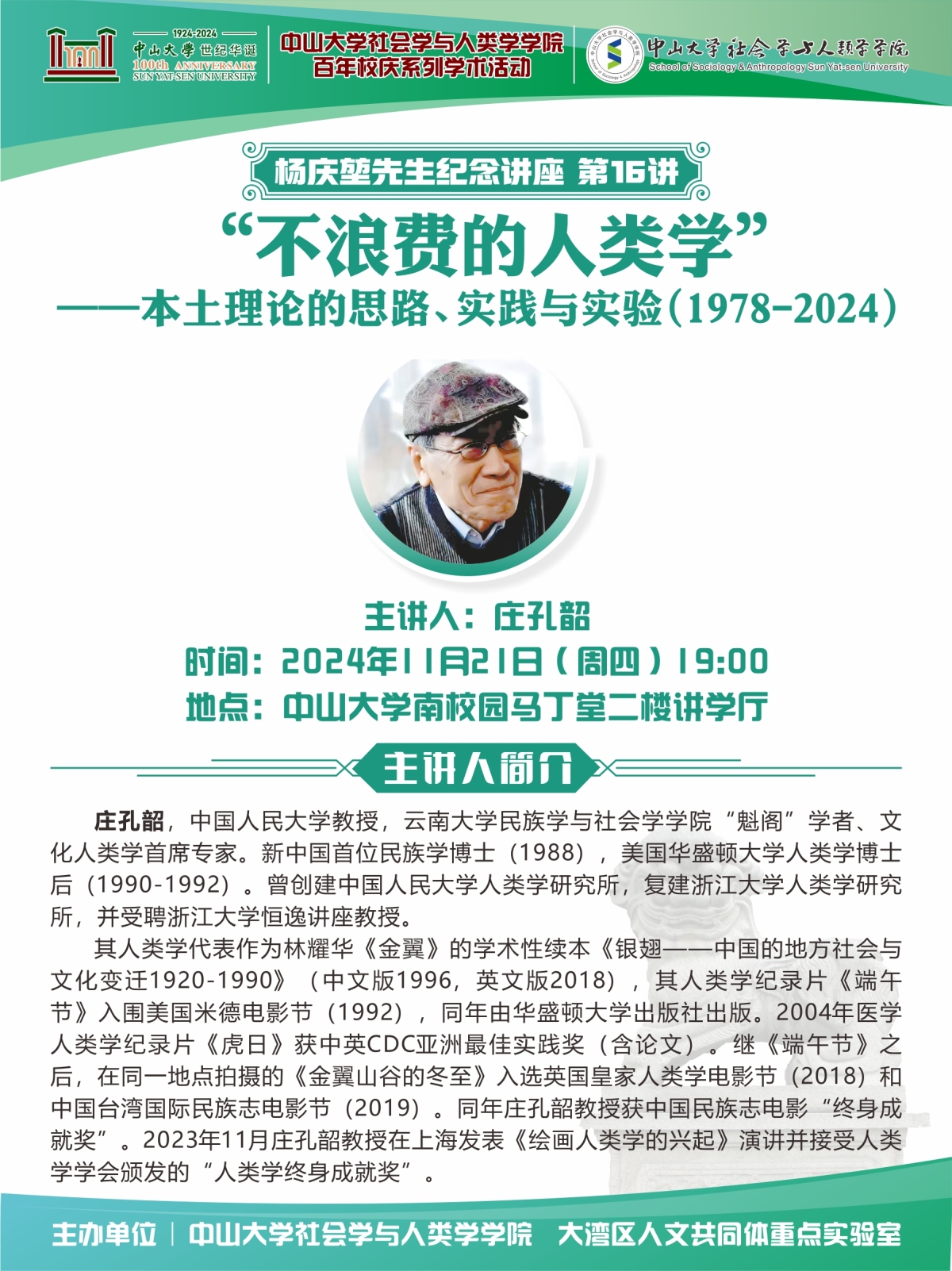 主讲人简介:庄孔韶,中国人民大学教授,云南大学民族学与社会学学院“魁阁”学者、文化人类学首席专家。曾创建中国人民大学人类学研究所,复建浙江大学人类学研究所,并受聘浙江大学恒逸讲座教授。