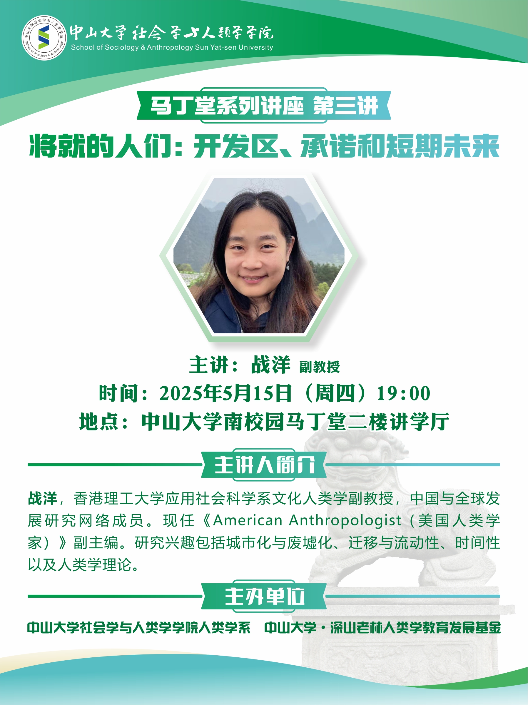 主讲人简介:战洋,香港理工大学应用社会科学系文化人类学副教授,中国与全球发展研究网络成员。现任《American Anthropologist(美国人类学家)》副主编。她的研究兴趣包括城市化与废墟化、迁移与流动性、时间性以及人类学理论。美国新学院(New School for Social Research)中印研究所的研究员。她的文章发表在《清华大学学报》、American Anthropologist、Urban Studies、Cities、Positions、Dialectical Anthropology、Anthropological Forum、China Information、Pacific Affairs等期刊上。曾获得2020年Eduard B. Vermeer最佳论文奖,并入围2022年的Holland Prize论文奖。