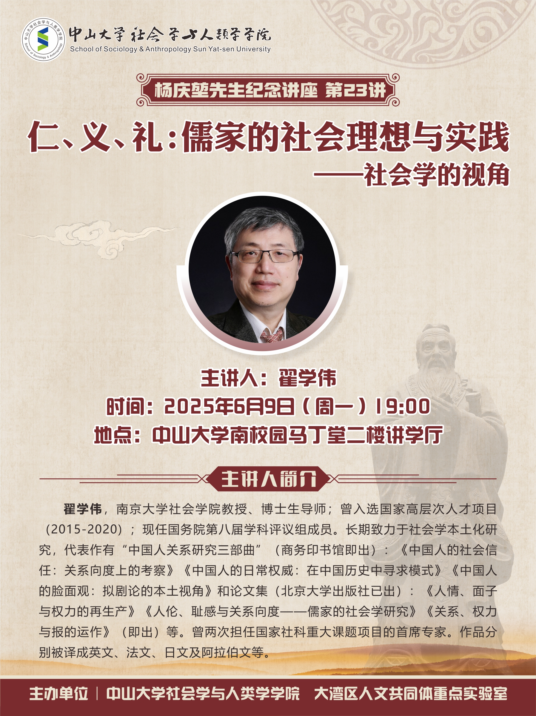 主讲人简介:翟学伟,南京大学社会学院教授、博士生导师;曾入选国家高层次人才项目(2015-2020);现任国务院第八届学科评议组成员。长期致力于社会学本土化研究,代表作有“中国人关系研究三部曲”(商务印书馆即出):《中国人的社会信任:关系向度上的考察》《中国人的日常权威:在中国历史中寻求模式》《中国人的脸面观:拟剧论的本土视角》和论文集(北京大学出版社已出):《人情、面子与权力的再生产》《人伦、耻感与关系向度——儒家的社会学研究》《关系、权力与报的运作》(即出)等。曾两次担任国家社科重大课题项目的首席专家。作品分别被译成英文、法文、日文及阿拉伯文等。