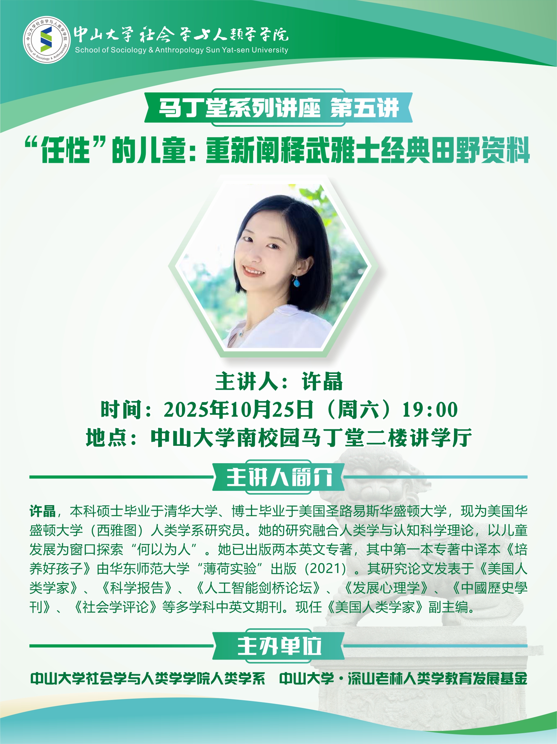 主讲人简介:许晶,本科硕士毕业于清华大学、博士毕业于美国圣路易斯华盛顿大学,现为美国华盛顿大学(西雅图)人类学系研究员。她的研究融合人类学与认知科学理论,以儿童发展为窗口探索“何以为人”。她已出版两本英文专著,其中第一本专著中译本《培养好孩子》由华东师范大学“薄荷实验”出版(2021)。其研究论文发表于《美国人类学家》、《科学报告》、《人工智能剑桥论坛》、《发展心理学》、《中國歷史學刊》、《社会学评论》等多学科中英文期刊。现任《美国人类学家》副主编。