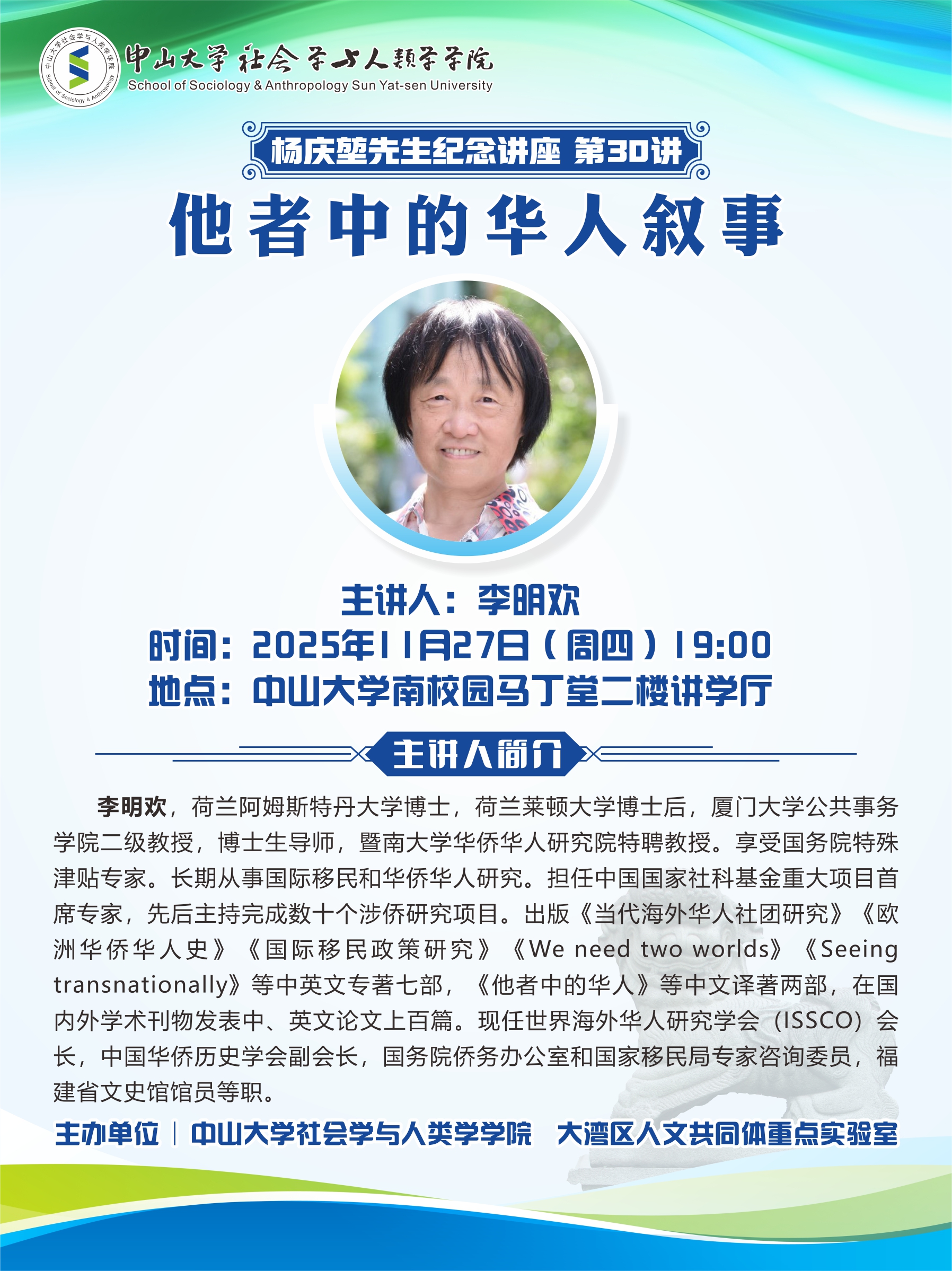 李明欢,荷兰阿姆斯特丹大学博士,荷兰莱顿大学博士后,厦门大学公共事务学院二级教授,博士生导师,暨南大学华侨华人研究院特聘教授。享受国务院特殊津贴专家。长期从事国际移民和华侨华人研究。担任中国国家社科基金重大项目首席专家,先后主持完成数十个涉侨研究项目。出版《当代海外华人社团研究》《欧洲华侨华人史》《国际移民政策研究》《We need two worlds》《Seeingtransnationally》等中英文专著七部,《他者中的华人》等中文译著两部,在国内外学术刊物发表中、英文论文上百篇。现任世界海外华人研究学会(ISSCO)会长,中国华侨历史学会副会长,国务院侨务办公室和国家移民局专家咨询委员,建省文史馆馆员等职。